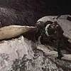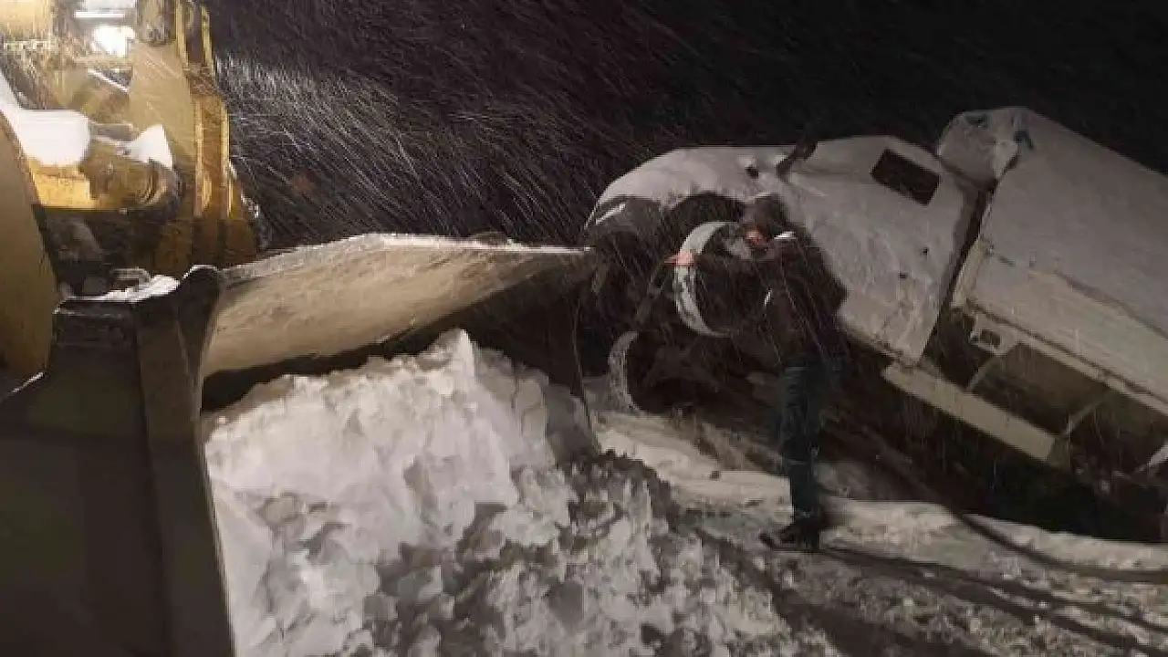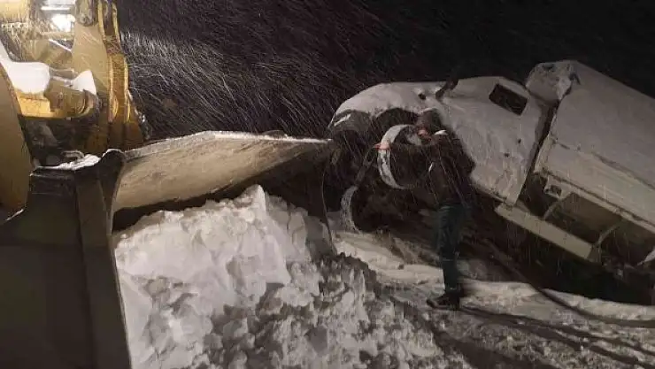 Adıyaman'ın Sincik ilçesinde kar ve tipi nedeniyle uçurumda asılı kalan araç, iş makineleri tarafından kurtarıldı.