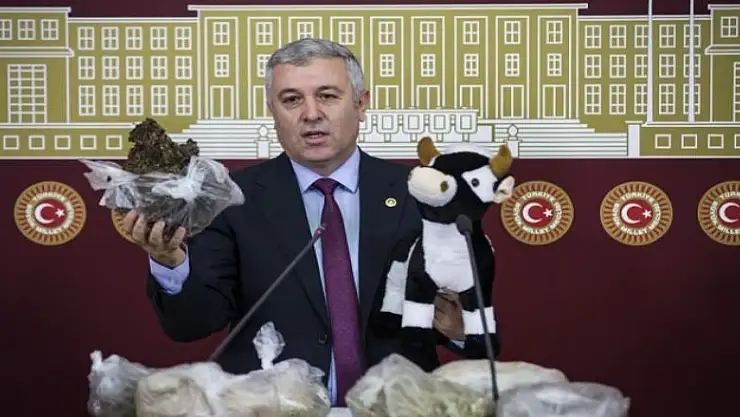 CHP Kayseri Milletvekili Çetin Arık, TBMM'de düzenlediği basın toplantısına oyuncak dana ile poşetlere konulan tezek ve hayvan yemleriyle geldi.