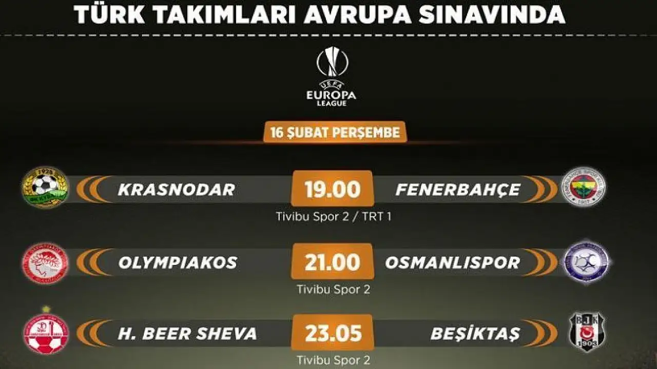 Son 32 turunun ilk maçında Beşiktaş ile İsrail temsilcisi Hapoel Beer-Sheva, Fenerbahçe ile Rusya'dan Krasnodar, Osmanlıspor ile Yunanistan'dan Olympiakos karşı karşıya gelecek.
