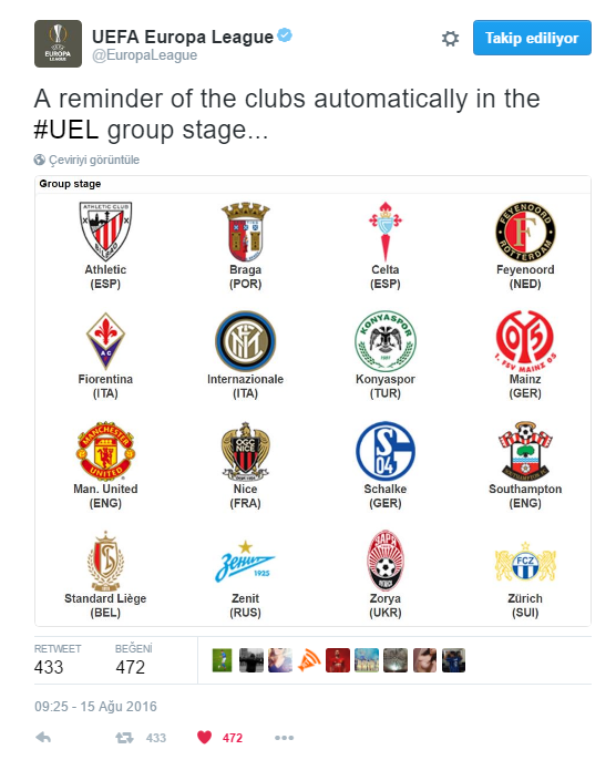 UEFA Europa League resmi twitter hesabından yapılan paylaşımda doğrudan gruplara kalan takımların isimleri yeniden açıklandı. Fotoğraflı olarak gruplarda yer alan takımların logolarının ve isimlerinin olduğu paylaşımda Athletic Bilbao (ESP), Braga (POR), Celta de Vigo (ESP), Feyenoord (NED), Fiorentina (ITA), Internazionale (ITA), Konyaspor (TUR), Mainz (GER), Manchester United (ENG), Nice (FRA), Schalke (GER), Southampton (ENG), Standard Liege (BEL), Zenit (RUS), Zorya (UKR), Zürich (SUI) takımları yer aldı.