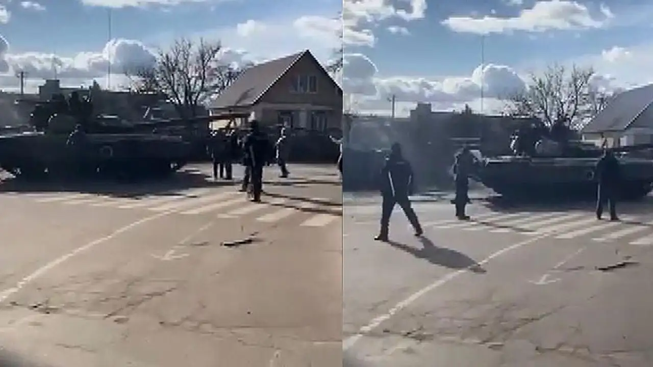 Ukrayna'da Rus askerlerinin bölgeden geçişini engellemek isteyen Ukraynalı sivil vatandaşlar, tankların önüne çıkarak karşı koymaya çalıştı.