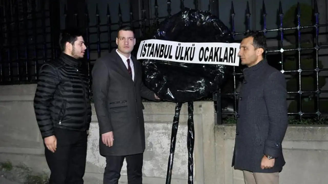 Ülkü Ocakları İstanbul İl Başkanı Kazım Erdi Aktunç, MHP Genel Başkanı Devlet Bahçeli'yle ilgili yazı nedeniyle Sözcü gazetesi önüne siyah çelenk bıraktı.