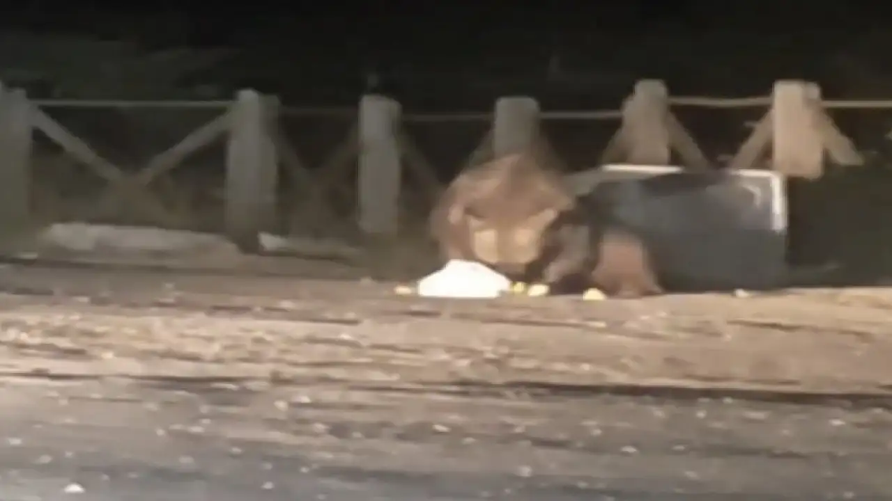Uludağ'da aç kalan ayı yemek aramak için oteller bölgesine indi. Çöp konteynırlarını deviren ayı daha sonra geldiği ormanlık alana giderek gözden kayboldu.