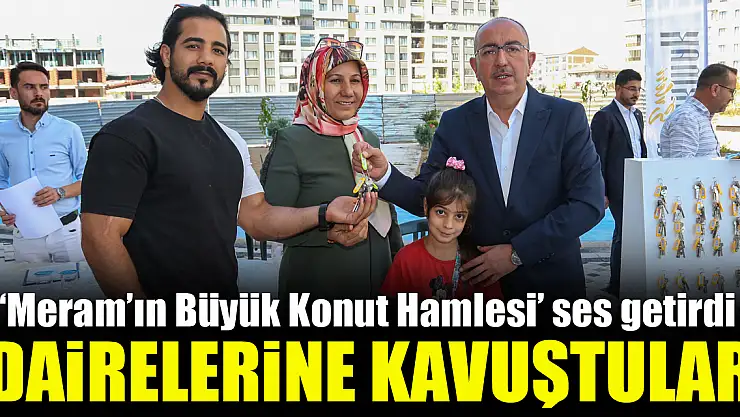 Meram Belediyesi öncülüğünde hayata geçirilen Uluırmak Evleri'nde hak sahipleri dairelerine kavuşmaya devam ediyor. Bu çerçevede 190 dairenin daha anahtarlarını sahiplerine teslim eden Meram Belediye Başkanı Mustafa Kavuş, 'Meram'ın Büyük Konut Hamlesi' sürecini bugünlere kadar hız ve başarı ile hemşehrilerimizle birlikte getirdik' diye konuştu.