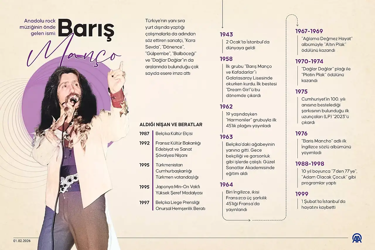 'Modern çağ ozanı, Anadolu rock ve pop müziğin önde gelen isimlerinden Mehmet Barış Manço 200 bestesi, '7'den 77'ye' programıyla gönüllerde kurduğu tahtı ve geride bıraktığı eşsiz kültürel mirasla vefatının 27. yıl dönümünde anılıyor.