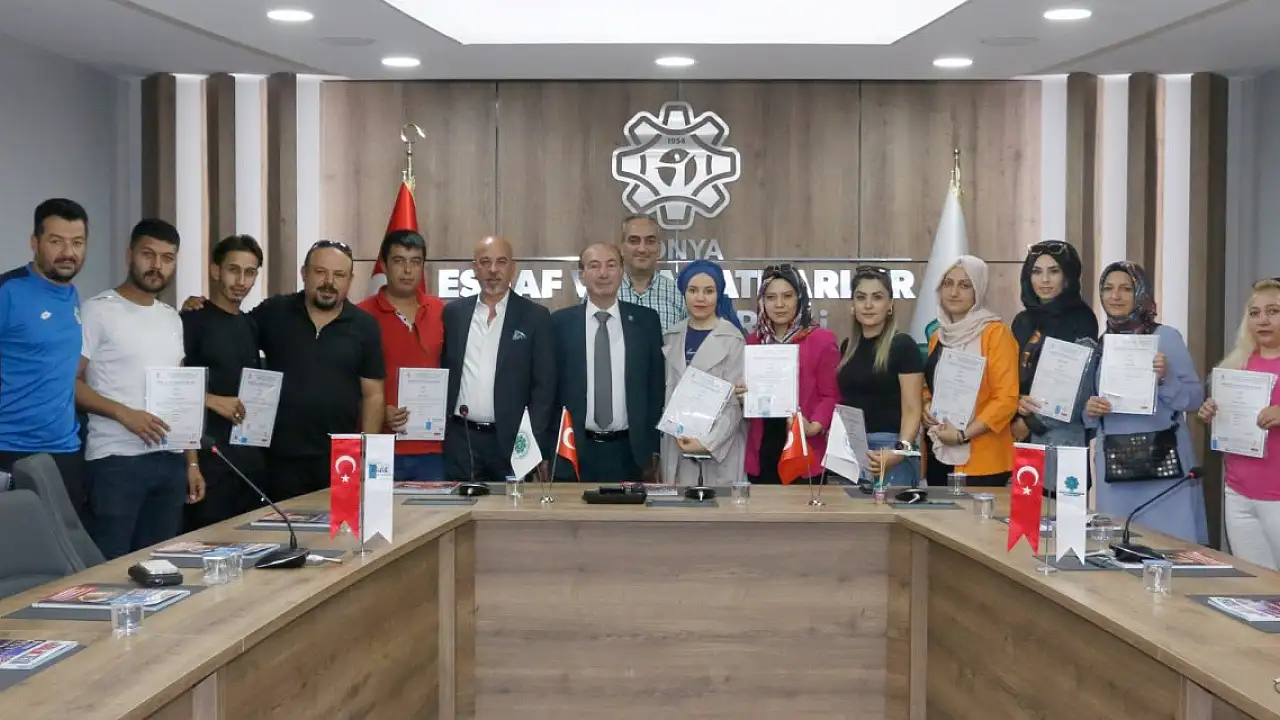 Konya'da mesleki eğitimler kapsamında Konya Esnaf ve Sanatkârlar Odaları Birliği ve Kuaförler Odasıyla birlikte düzenlenen, Bay bayan kuaför seviye 4, Epilasyon seviye 4, Ustalık belgesi için verilen MYK Mesleki Yeterlilik Belgesi teorik ve performans sınavlarında belge almaya hak kazanan adaylara belgeleri verildi.