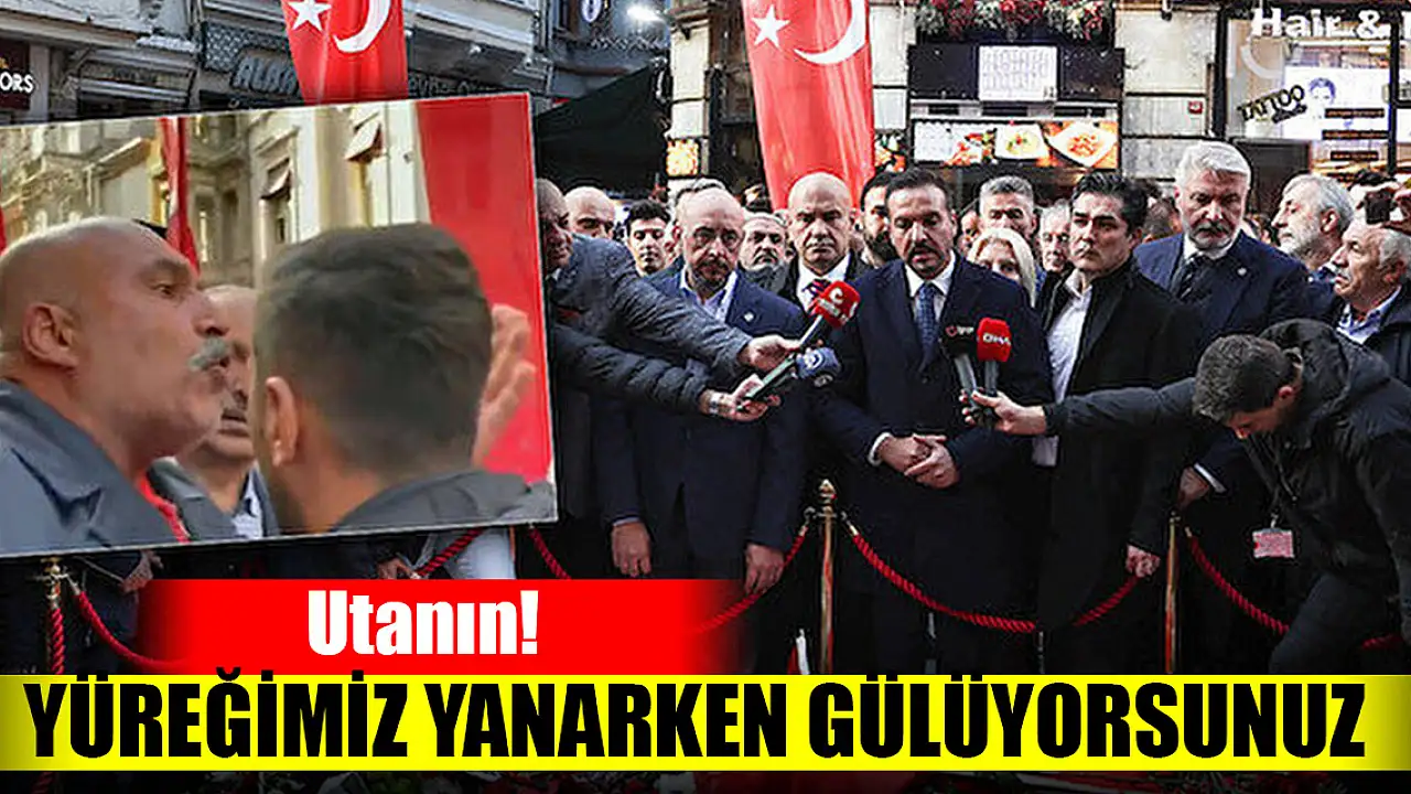 İstiklal Caddesi'nde bombalı saldırının meydana geldiği bölgeye çiçek bırakan İYİ Parti heyeti kendi arasında gülüşünce vatandaşın tepkisini çekti. 'Sabahtan beri hepiniz gülüyorsunuz. Utanın be... Bugün ağlanır, gülünür mü?' diyen vatandaş, 'Yüreğimiz yanmış siz orada gülüyorsunuz. Lokum yiye yiye buraya geliyorsunuz. Ayıptır ya bugün gülmeyin.' ifadelerini kullandı.