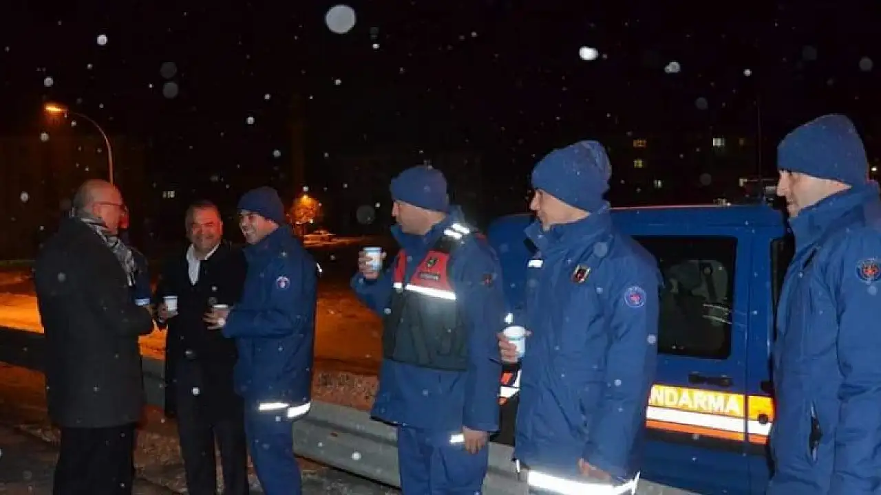 "Kara yolu üzerindeki güvenlik noktasında görevi başındaki Jandarmamızı nöbet yerlerinde ziyaret ederek çay ikramında bulunduk. Havanın soğuk oluşuna rağmen sıcak sohbetleriyle içimizi ısıtan jandarmamıza teşekkür ediyorum. Bu soğukta görevi başında nöbet tutan tüm asker, polis ve güvenlik güçlerimize Rabbim kolaylık versin."