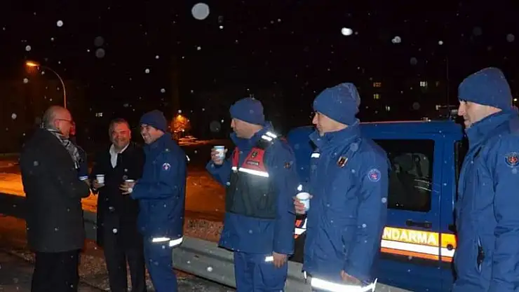 Kaymakam Kadiroğlu ve Başkan Karahan yağışlı ve soğuk havada görevlerini aksatmayan Jandarma ekiplerine çay ikramında bulunarak bir süre sohbet etti.