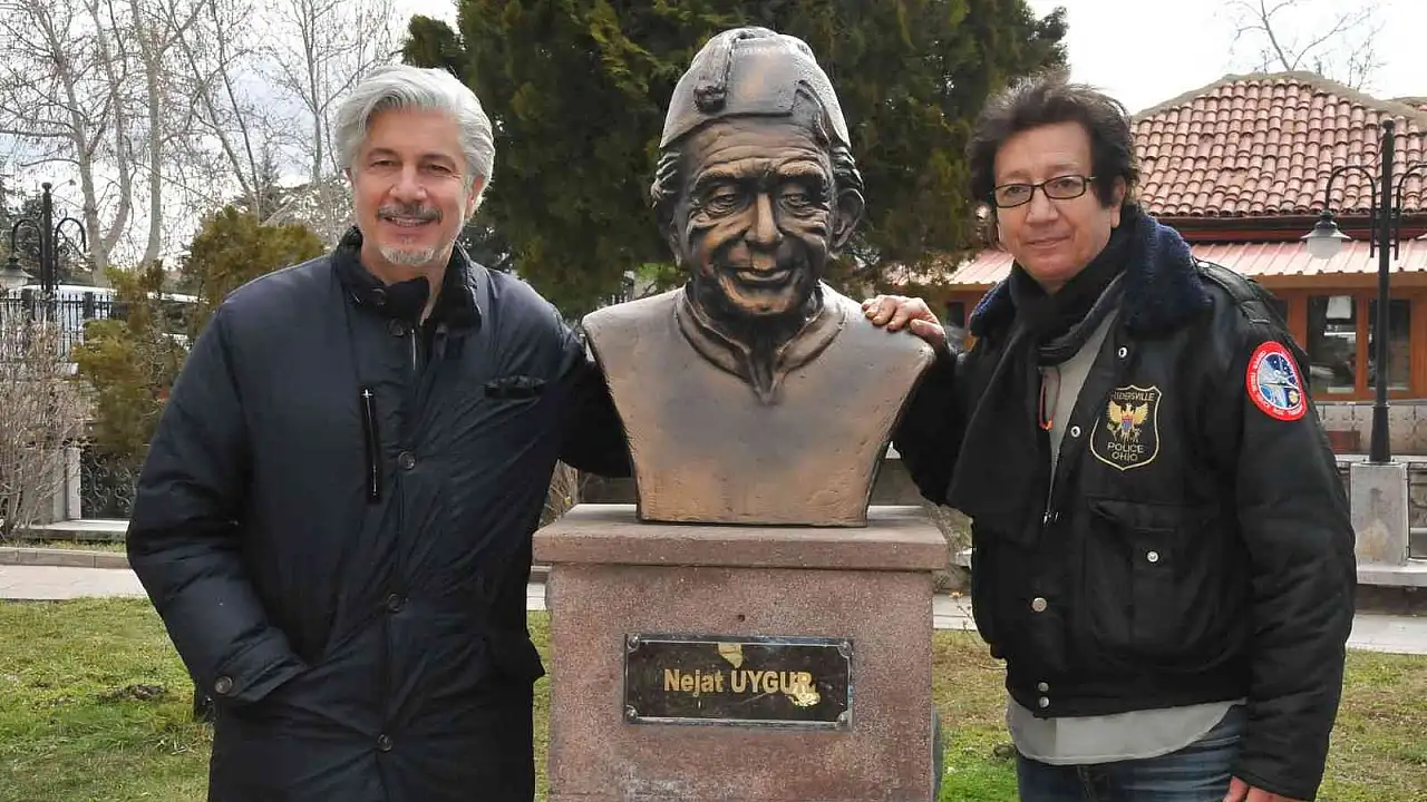 Konya'nın Akşehir ilçesine gelerek 'Süt Kardeşler' isimli tiyatro oyununu sergileyen Süheyl ve Behzat Uygur kardeşler, tiyatro sanatçılarının büstlerinin yer aldığı alanda babaları Nejat Uygur'un büstünü görünce duygu dolu anlar yaşadı.
