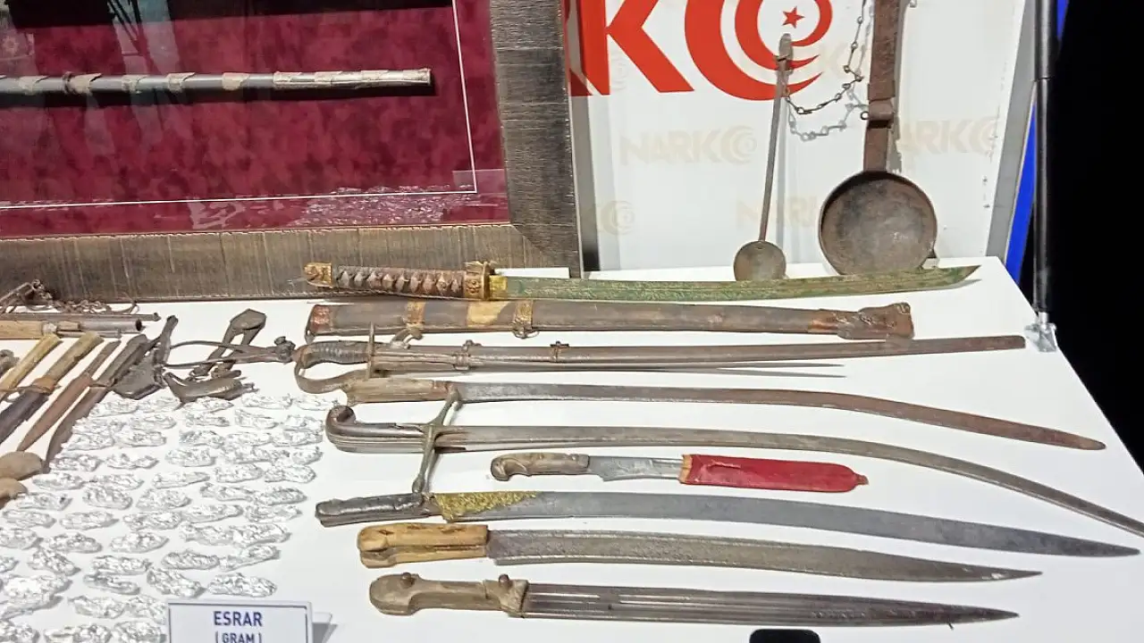 Ankara Emniyet Müdürlüğü Narkotik Suçlarla Mücadele ekipleri ihbar üzerine Çankaya'da M.Y.T. isimli şüpheliyi yakaladı. Şüpheli M.Y.T'nin üzerinde yapılan aramada 2 gram esrar uyuşturucu maddesi ele geçirildi. Yakalanan M.Y.T.'nin beyanları ve yapılan teknik- fiziki takibin ardından uyuşturucu tedarikçisinin M.E. olduğunu tespit eden polis ekipleri, şüpheliyi yakalamak için harekete geçti. M.E.'nin Bahçelievler Mahallesi'nde bulunan evine düzenlenen operasyonda 73 gram esrar ele geçirildi. Evde yapılan aramalarda tarihi eser olduğu değerlendirilen 5 tüfek, 43 sikke, 5 mühür, 23 obje, 4'ü kılıfsız 6 kılıç ve 8 hançer, 7 toplu tabanca ve 2 barutluk ele geçirildi.