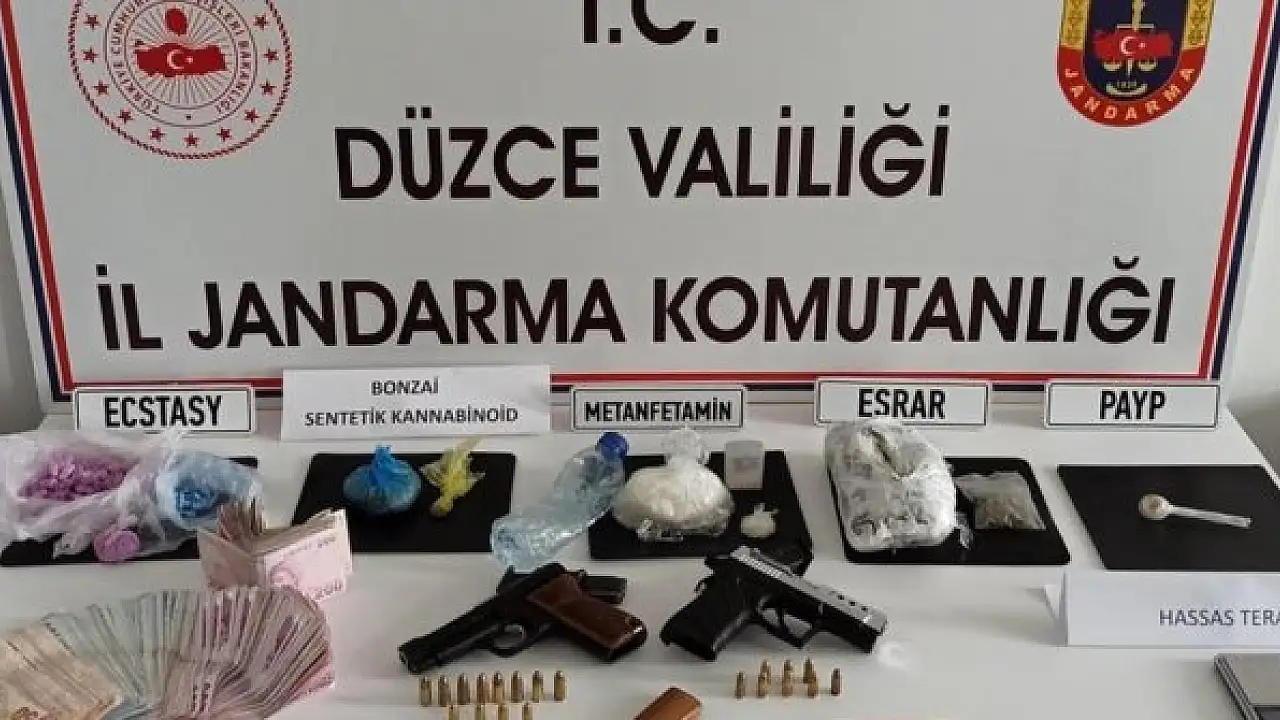 Düzce'de jandarma ekipleri uyuşturucu ticareti yapan 2 şahsı gözaltına aldı. Şahısların evinde yapılan aramada çok sayıda uyuşturucu madde ele geçirildi.