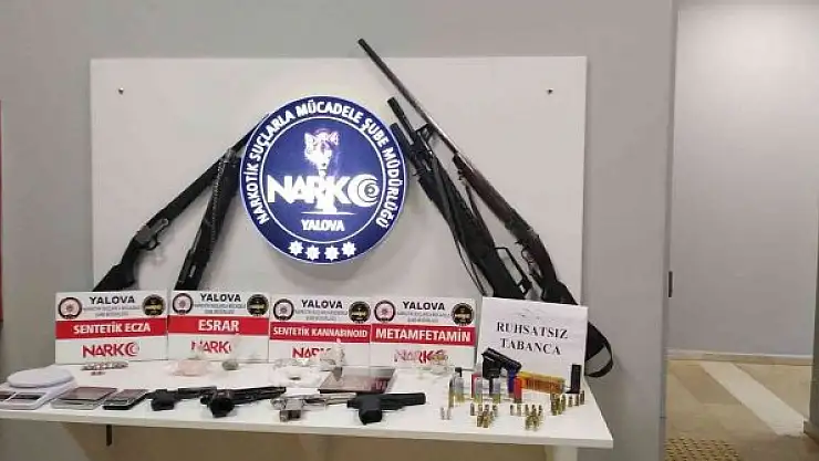 Alınan bilgiye göre, Yalova İl Emniyeti Narkotik Suçlarla Mücadele Şube Müdürlüğü ekipleri, gerçekleştirdiği operasyonlarla uyuşturucu satıcıları ve kullanıcılarına göz açtırmıyor. Polis ekipleri sokak düzeyinde uyuşturucu ticareti yaptığı ileri sürülen Ş.A'ya yönelik operasyon gerçekleştirdi. Dedektör köpek Zeytin eşliğinde şahsın evinde yapılan aramada, 15 gram metamfetamin, 11,65 gram esrar, 6,54 gram sentetik kannabinoid, 16 adet sentetik ecza grubu tablet hap, 4 adet hassas terazi, 5 adet namlusu açık tabanca, tabancalara ait 13 şarjör ve mermiler ele geçirildi.