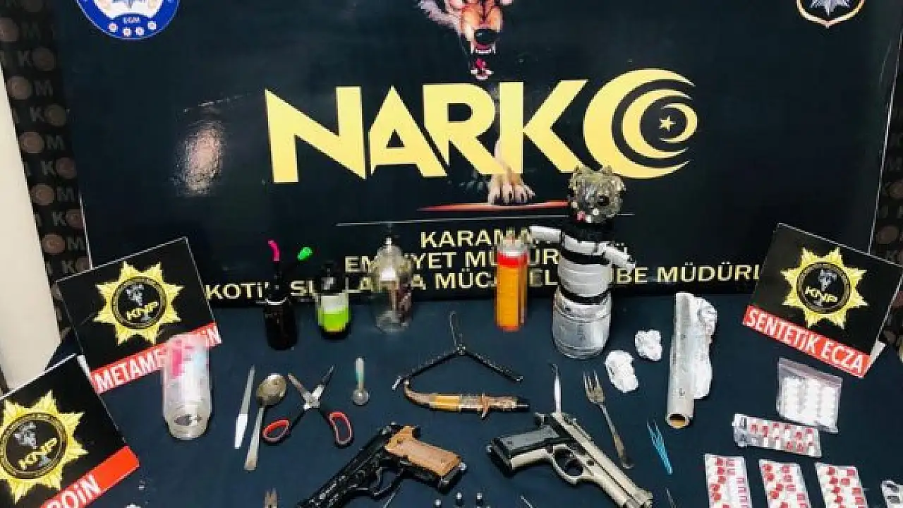 Edinilen bilgiye göre, Cumhuriyet Başsavcılığının koordinesinde yürütülen soruşturma doğrultusunda İl Emniyet Müdürlüğü Narkotik Suçlarla Mücadele Şubesi ekipleri, kentte uyuşturucu satışı yapanlara yönelik sabaha karşı Karaman merkez ile Konya ilinde eş zamanlı operasyon yaptı. Yapılan operasyonda haklarında yakalama kararı verilen 9 şüpheliden 7'si evlerinde yakalanarak gözaltına alındı. Adreslerinde bulunamayan 2 şüpheliyi yakalanma çalışmaları başlatıldı. Gözaltına alınan şüpheliler Karaman Eğitim ve Araştırma Hastanesinde sağlık kontrolünden geçirildikten sonra sorgulanmak üzere İl Emniyet Müdürlüğüne götürüldü. Operasyonda şüphelilerin evlerinde yapılan aramalarda da 50 gram esrar, 100 gram metamfetamin, 15 gram bonzai, 377 adet reçeteye tabi hap, 5 adet payp tabir edilen aparat 1 adet hassas terazi, 3 adet bıçak ve 2 adet kuru sıkı tabanca ele geçirildi.