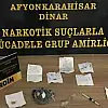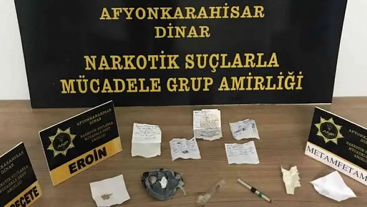 Olay, Dinar ilçe merkezinde meydana geldi. Edinilen bilgilere göre, Dinar İlçe Emniyet Müdürlüğü'ne bağlı Narkotik Suçlarla Mücadele Grup Amirliği ekipleri tarafından yapıldı. Şüphe üzerine bir şahsı takibe alan ekipler ardından şüpheliyi durdurarak üst araması yaptı. Aramada E.S., isimli şahsın üzerinde 6.86 gram eroin, 1.7 gram metamfetamin, sentetik peçeteye emzirilmiş 163 içimlik uyuşturucu ile üzerinde 5 kişinin isminin ve para miktarının belirtildiği çizelge ile ele geçirildi. Uyuşturucu madde ticareti yapma suçundan gözaltına alınan şahsın işlemlerinin ardından adliyeye sevk edileceği kaydedildi.