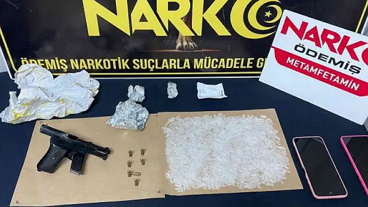Ödemiş Narkotik Suçlarla Mücadele Grup Amirliği ekipleri, R.A. adlı bir kadının ilçede uyuşturucu ticareti yaptığı bilgisi üzerine harekete geçti. R.A.'yı teknik ve fiziki takibe alan ekipler, şüphelinin dün ticari taksi içerisinde ilçe girişinde olduğunu belirledi. Polis ekipleri tarafından ticari taksiden indirilen R.A. üzerinde yapılan aramada, 123 gram metamfetamin maddesi, 1 adet ruhsatsız tabanca ve 7 fişek ele geçirildi. Şüpheli, sorgulanmak üzere emniyete götürüldü.