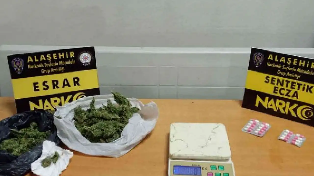 Alaşehir İlçe Emniyet Müdürlüğü Narkotik Suçlarla Mücadele Grup Amirliği ve İlçe Emniyet Müdürlüğü görevlilerince "Uyuşturucu madde satan, kullanan ve nakleden" şahıslara yönelik dün yapılan çalışmalar çerçevesinde İ.K. (29), M.G. (29) ve İ.Ö. (31) isimli şahıslarla birlikte 18 adet 300 mg sentetik ecza hapı, peçeteye sarılı halde daralı 3.03 gram esrar, beyaz poşet içerisinde daralı 55.81 gram esrar, siyah poşet içerisinde daralı 20.75 gram esrar, 1 adet hassas terazi olmak üzere toplamda 79.59 gram esrar ele geçirildi. Zanlılardan İ.K. çıkarıldığı mahkeme tarafından tutuklanırken, diğer şahısların savcılık tarafından serbest bırakıldığı açıklandı.