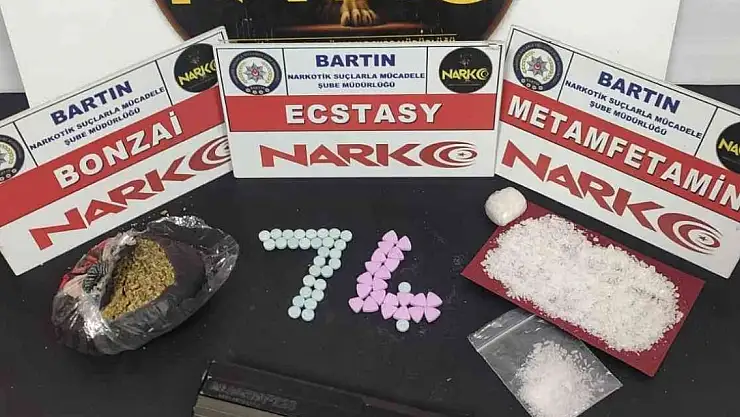 Bartın İl Emniyet Müdürlüğü Narkotik Suçlarla Mücadele Şube Müdürlüğü ekiplerince Zonguldak- Bartın Karayolu üzerinde yapılan kontroller sırasında durumundan şüphelenerek durdurulan R. K. isimli şahsın üzerinde yapılan aramada; 3 parça halinde 28,83 gram metamfetamin maddesi, 51,54 gram sentetik kannabinoid(bonzai), 54 adet ecstasy hap ve 1 adet Ruhsatsız Tabanca ile 1 adet mermi ele geçirildi. Uyuşturucu hap ve maddelere el konulurken gözaltına alınan R.K. isimli şahıs emniyetteki işlemlerinin ardından çıkarıldığı adli makamlarca tutuklandı.