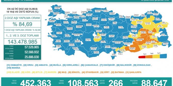 Sağlık Bakanlığı tarafından Türkiye'nin yeni korona virüs tablosu açıklandı. 9 Şubat'ta açıklanan 24 saatlik verilere göre 108 bin 563 vaka tespit edildi. Virüs nedeniyle hayatını kaybedenlerin sayısı 266 oldu. Bir günde toplam 452 bin 363 test yapılırken, iyileşen hasta sayısı 88 bin 647 olarak kaydedildi. Sağlık Bakanlığı tarafından açıklanan tabloda, 2 doz aşılama verilerine de yer verildi. En az 2 doz aşı olmuş 18 yaş üzeri nüfusu kapsayan verilere göre Türkiye'de 2. doz aşılama ortalama yüzde 84,69 oldu. 1. doz ortalaması yüzde 92,68 olurken, 1., 2. ve 3. doz aşısını olan vatandaş sayısı toplamda 143 milyon 478 bin 985'e yükseldi.