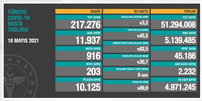 Sağlık Bakanlığı'nca duyurulan "Türkiye Covid- 19 Hasta Tablosu'na göre; son 24 saatte yapılan 217 bin 276 testte 11 bin 937 vaka, 916 hasta tespit edildi. Virüs nedeniyle 203 kişi hayatını kaybederken, 10 bin 125 kişinin de tedavisi ve karantinası sona erdi. Bugünkü verilerle toplam test sayısı 51 milyon 294 bin 8, toplam vaka sayısı 5 milyon 139 bin 485, toplam vefat sayısı 45 bin 186, toplam ağır hasta sayısı 2 bin 232, toplam iyileşen sayısı ise 4 milyon 971 bin 245 oldu. Tabloda haftalık oranlar ise hastalarda zatürre oranı yüzde 3,2, yatak doluluk oranı yüzde 45,5, erişkin yoğun bakım doluluk oranı yüzde 62,5, solunum cihazına bağlı (ventilatör) doluluk oranı yüzde 30,7, ortalama temaslı tespit süresi 8 saat, filyasyon oranı yüzde 99,9 şeklinde yer aldı.