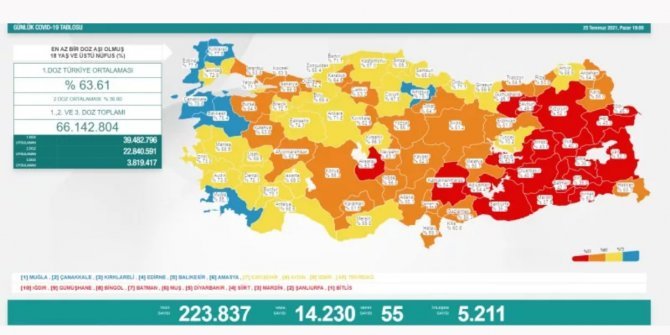 Türkiye'de son 24 saatte 223 bin 837 COVID-19 testi yapıldı, 14 bin 230 kişinin testi pozitif çıktı, 5 bin 211 kişi iyileşti, 55 kişi hayatını kaybetti.