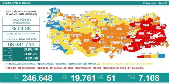 En az bir doz aşı uygulananların oranının en yüksek olduğu 10 il sırasıyla Muğla, Çanakkale, Kırklareli, Edirne, Balıkesir, Amasya, Eskişehir, Aydın, İzmir ve Tekirdağ oldu.