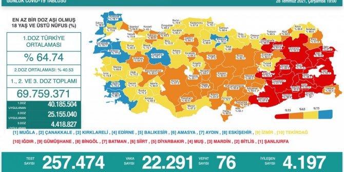 En az bir doz aşı yapılanların oranının en az olduğu iller ise Şanlıurfa, Bitlis, Mardin, Muş, Diyarbakır, Siirt, Batman, Bingöl, Gümüşhane ve Iğdır olarak sıralandı.