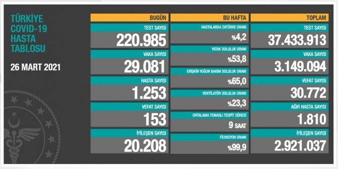 Test sayısı 37 milyon 433 bin 913'e ulaştı. Vaka sayısı 3 milyon 149 bin 94, vefat sayısı 30 bin 772, ağır hasta sayısı 1810 oldu.