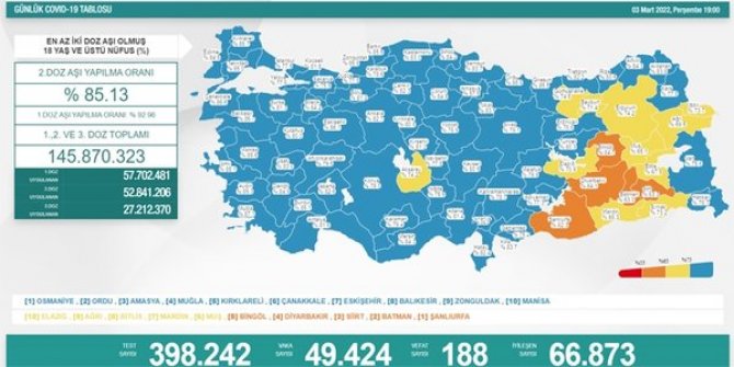 Buna göre, son 24 saatte 398 bin 242 COVID-19 testi yapıldı, 49 bin 424 kişinin testi pozitif çıktı, 188 kişi yaşamını yitirdi, iyileşenlerin sayısı 66 bin 873 oldu.