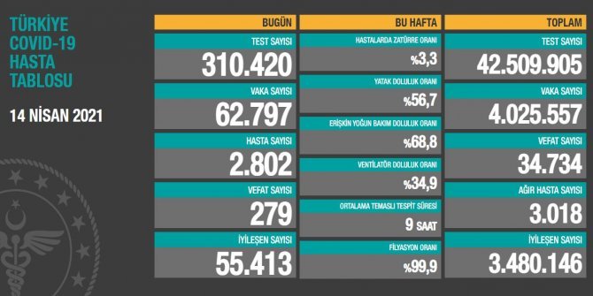 Türkiye'de son 24 saatte 310 bin 420 Kovid-19 testi yapıldı, 62 bin 797 kişinin testi pozitif çıktı, 279 kişi hayatını kaybetti.