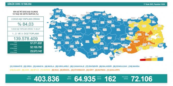 18 yaş üstü nüfusta birinci doz aşı uygulananların oranı yüzde 92,27,ikinci doz aşı uygulananların oranı yüzde 84,03 olarak kayda geçti.