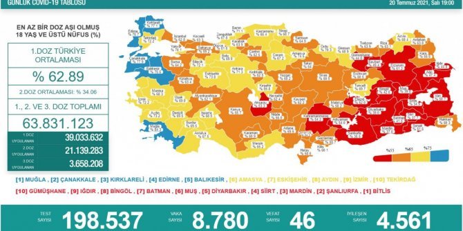 Türkiye'de son 24 saatte 198 bin 537 COVID-19 testi yapıldı, 8 bin 780 kişinin testi pozitif çıktı, 4 bin 561 kişi iyileşti, 46 kişi hayatını kaybetti.