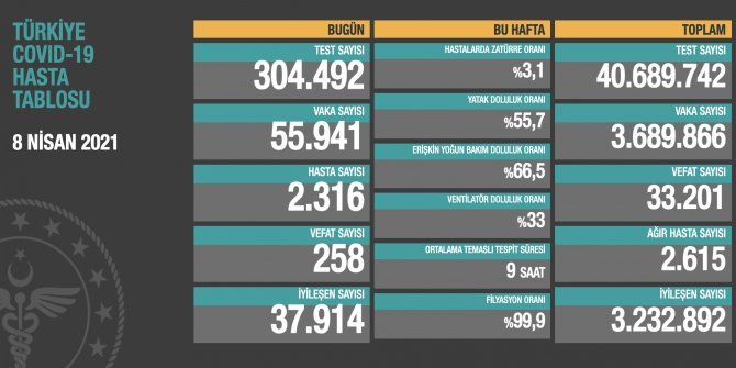 Buna göre, Türkiye'de son 24 saatte 304 bin 492 Kovid-19 testi yapıldı, 55 bin 941 kişinin testi pozitif çıktı, 258 kişi yaşamını yitirdi, hasta sayısı 2 bin 316 oldu.
