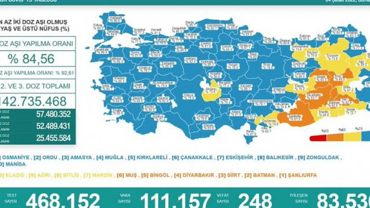 En az iki doz aşı uyulananların oranı en yüksek 10 il sırasıyla Osmaniye, Ordu, Amasya, Muğla, Kırklareli, Çanakkale, Eskişehir, Balıkesir, Zonguldak ve Manisa oldu.