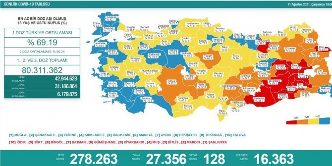 Türkiye'de son 24 saatte 278 bin 263 COVID-19 testi yapıldı, 27 bin 356 kişinin testi pozitif çıktı, 128 kişi hayatını kaybetti.