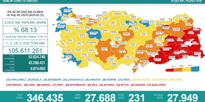 En az iki doz aşı uygulananların oranı en yüksek 10 il sırasıyla Kırklareli, Muğla, Eskişehir, Çanakkale, Amasya, Edirne, Ordu, Balıkesir, Burdur ve İzmir oldu.