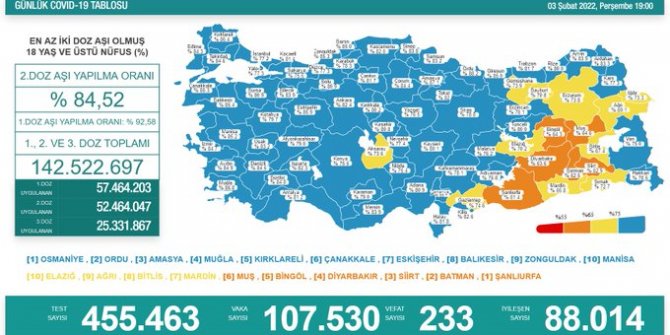 Sağlık Bakanlığı 3 Şubat koronavirüs tablosunu açıkladı. Türkiye'de son 24 saatte 107 bin 530 yeni vaka tespit edilirken, 233 kişi hayatını kaybetti.