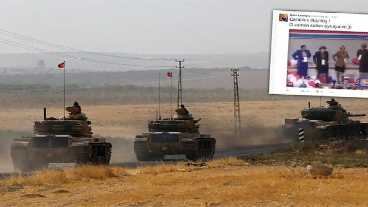 TSK'nın Cerablus'a girişini resmi Twitter hesabından paylaşan Antalya Valisi Münir Karaloğlu'nun tweeti dikkat çekti. Karaloğlu, 4 kadının 'makarena dansı' yaptığı videoyu, “Cerablus düşmüş! Ozaman kalkın oynayalım" notu ile paylaştı. Karaloğlu'nun 'makarena dansı' yapan kadınların yer aldığı paylaşımı, HDP Eş Genel Başkanı Selahattin Demirtaş'ın daha önce Twitter'dan yaptığı Membiç paylaşımına yanıt olarak değerlendirildi.Paylaşımının sonuna gülümseyen emotion işareti koyan Vali'nin paylaşımı, çok sayıda beğeni ve retweet aldı.