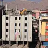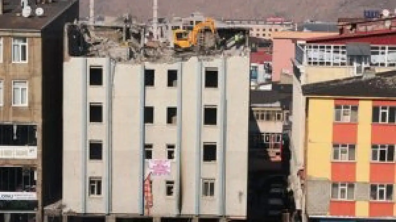 Van'da yaşanan depremde ağır hasar gören altı katlı bir binanın yıkım çalışmaları sırasında aşağıya hafriyat parçalarının düşmesi adeta faciaya davetiye çıkartıyor.
