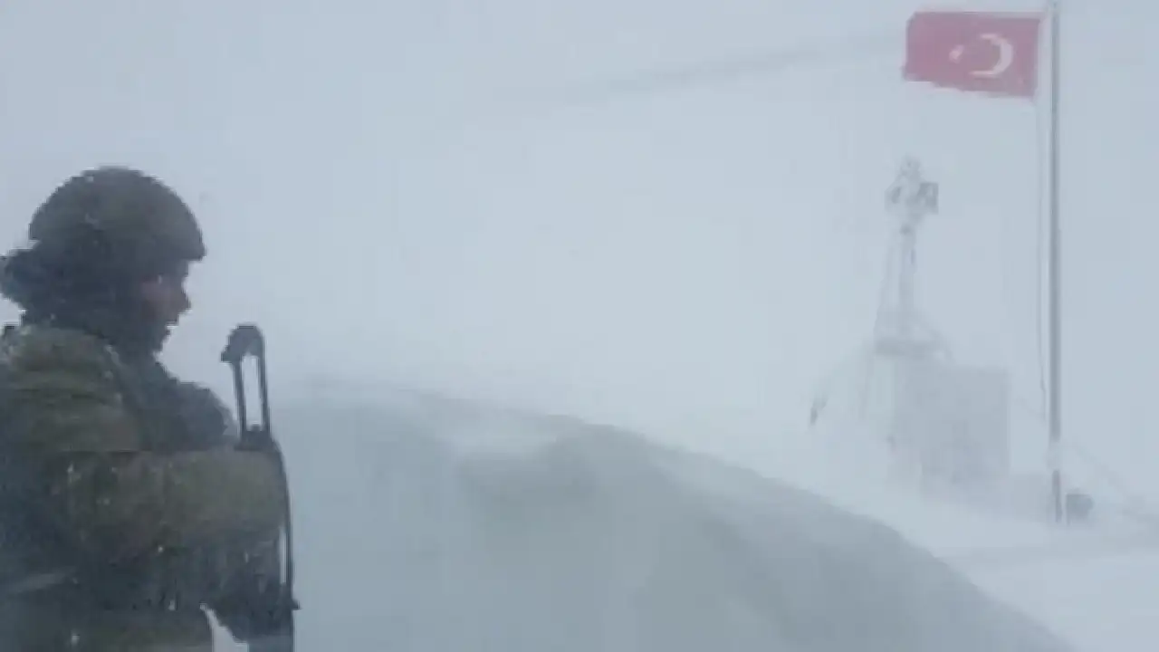 Görüntülerde, Hakkari'nin Yüksekova ilçesindeki askerlerin, barınağın önünün kapanmaması için kar kürediği, yoğun kar yağışı ve tipi altında vatan nöbeti tuttuğu görülüyor.