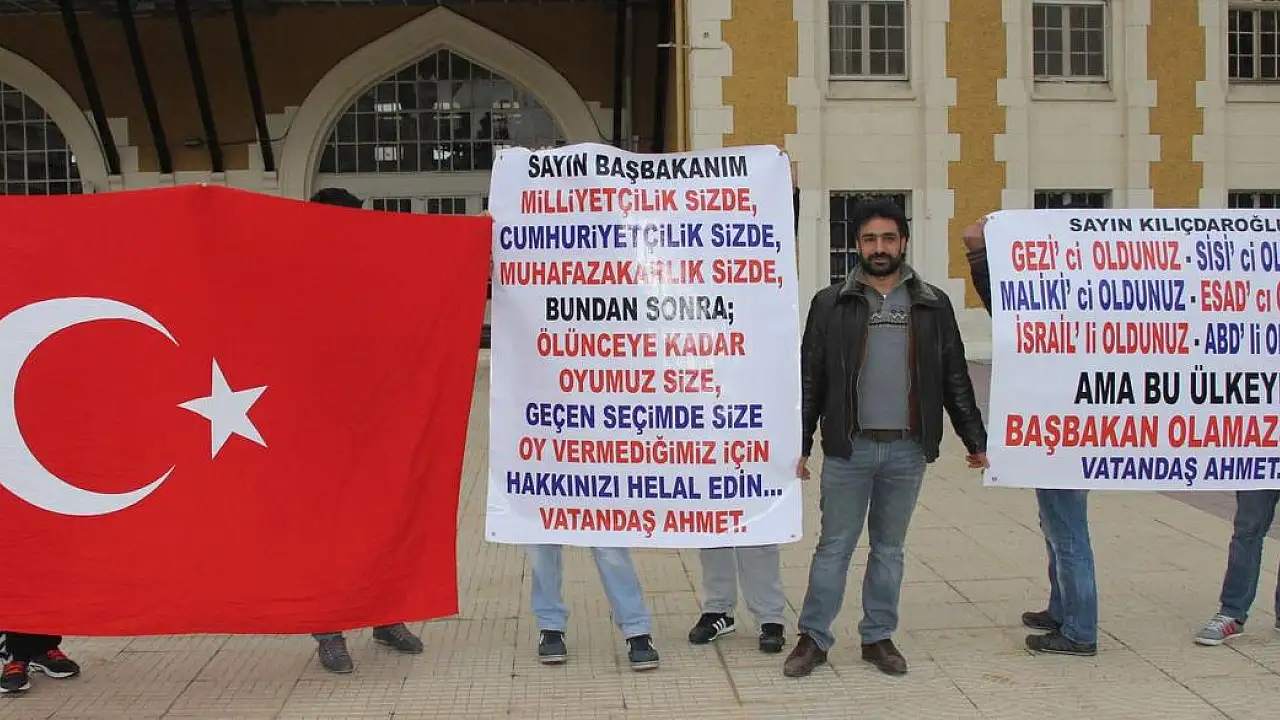 Arıç bir başka pankartta ise CHP Genel Başkanı Kemal Kılıçdaroğlu'na yönelik, "Sayın Kılıçdaroğlu, Gezici oldunuz, Sisi'ci oldunuz, Maliki'ci oldunuz, Esad'cı oldunuz, İsrail'li oldunuz, ABD'li oldunuz, ama bu ülkeye Başbakan olamazsınız. Vatandaş Ahmet" yazılı pankartı açtı.