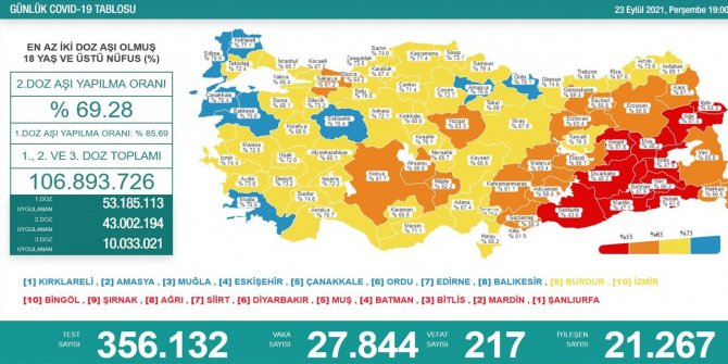 18 yaş üstü nüfusta birinci doz aşı uygulananların oranı yüzde 85,69, ikinci doz aşı uygulananların oranı yüzde 69,28 olarak kayda geçti.