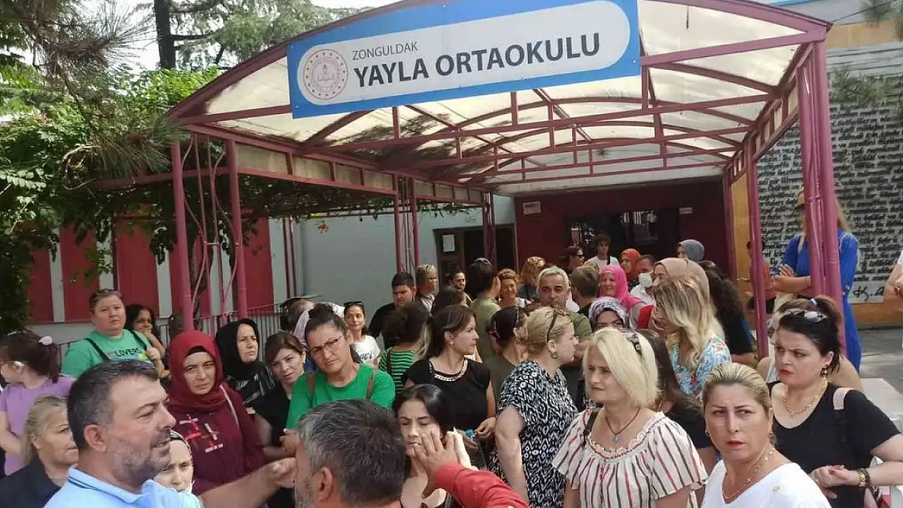Kentte depreme dayanıksız olduğu gerekçesiyle üç okulun yıkılıp yerine yenilerinin yapılacağı kararının alınmasının ardından 1942 yılında yapılan Yayla Ortaokulu'nun velileri okul önünde toplandı.