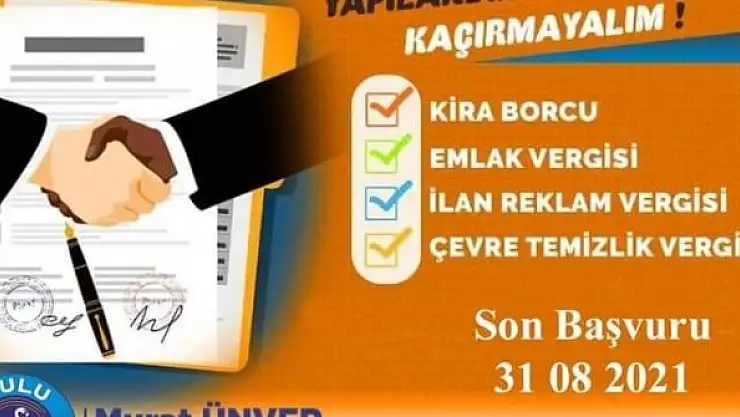 Kulu Belediye Başkanlığı tarafından yapılan açıklamada, vergi borcu olanlara son gün uyarısı yapıldı. Açıklamada, “Belediyemize; Emlak Vergisi, Çevre Temizlik Vergisi, İlan Reklam Vergisi ve Kira Borcu bulunan vatandaşlarımızın borçlarını 7326 sayılı kanuna göre yeniden yapılandırmaları için belediyemize müracaat etmeleri duyurulur. Son başvuru tarihi 31/08/2021 mesai bitimine kadardır” denildi.