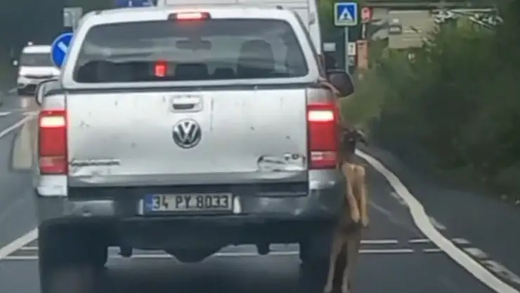 Sarıyer'de seyir halindeki pikabın arkasında asılı şekilde görülen köpek görüntüleri büyük tepkilere neden oldu. Başka bir sürücü tarafından cep telefonu ile görüntülenen olay, sosyal medyada büyük tepkiye neden oldu. Polis ekipleri sürücüyü ifadesinin alınması için polis merkezine götürdü.