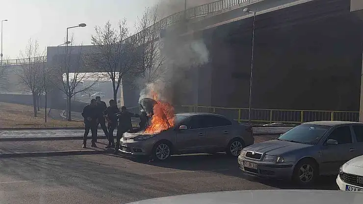 Konya'da seyir halindeyken motor kısmı alev alev yanmayan otomobil, yoldan geçen sürücülerin yangın tüpleriyle müdahalesi sonucu daha fazla büyümeden söndürüldü.