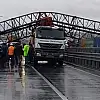 E-5 Otoyolu Büyükçekmece Mevkii'nde yan yol çalışmasında kullanılan vinç, beton mikserinin üzerinde devrildi.