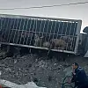 Virajı alamayan hayvan yüklü tır devrildi
