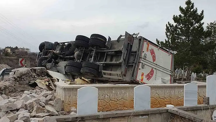 Kayseri'nin Hacılar ilçesinde virajı alamayan tırın mezarlığa devrilmesi sonucu meydana gelen kazada sürücü yaralandı.