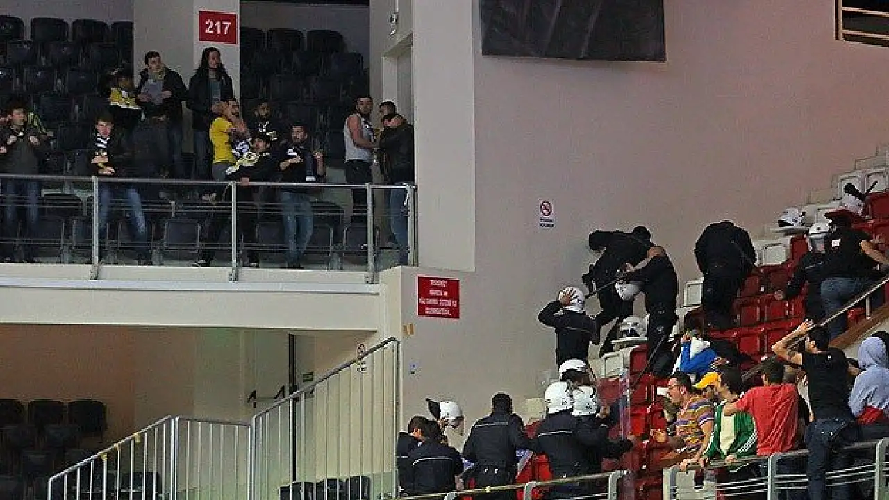 Karşılıklı olarak çeşitli yabancı maddelerin atıldığı gerginlikte, taraftarlar birkaç koltuk kırarak, birbirlerine fırlattı. Bu sırada Galatasaray tribününden salona inerek, Fenerbahçe tribününe doğru giden bir taraftar fark edildikten sonra güvenlik güçleri tarafından gözaltına alındı.